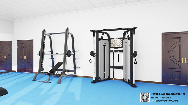 5.KS娱乐体育史密斯机SH-G6853*1台-锻炼股四头肌、股二头肌、肱三头肌;史密斯机采用固定轨迹的杠铃设计,大大降低了训练过程中的安全风险,通过深蹲、卧推、肩推等经典动作,可以针对性地锻炼腿部力量、上肢力量、背部肌群、胸部塑形以及肩部稳定等,从而全面提升身体素质,满足不同的健身需求;