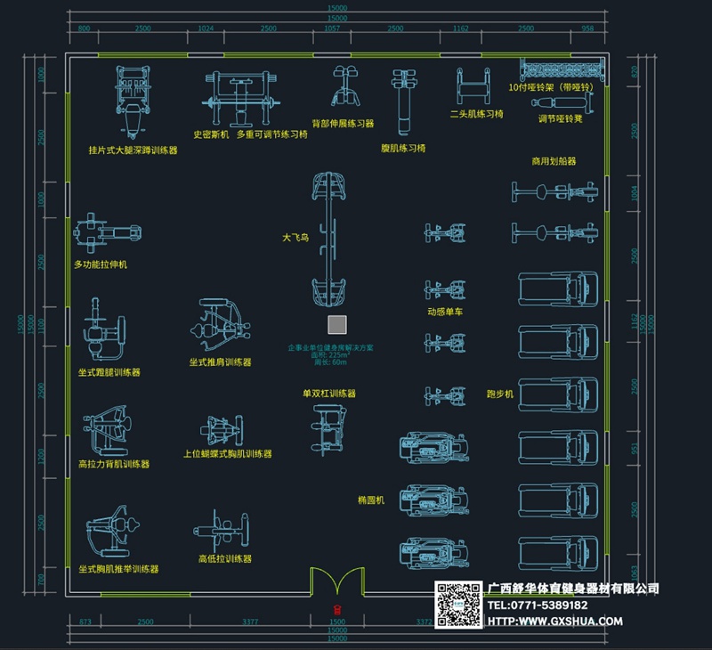 此方案要求面积小于225m²,适用于企事业单位、酒店会所、楼盘社区、学校、商用等健身场所,能满10-15人同时健身使用。(方案根据场地空间大小、预算、产品需求等进行配置仅为启发性参考)