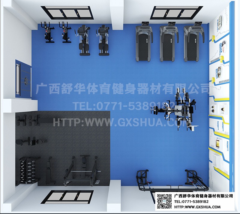 此方案要求面积小于110m²,适用于企事业单位、酒店会所、楼盘社区、学校、工作室等健身场所,能满15-20人同时健身使用。(方案根据场地空间大小、预算、产品需求等进行配置仅为启发性参考)