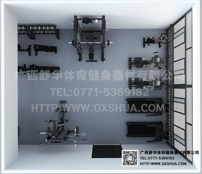 此方案要求面积小于45m²,适用于企事业单位、酒店会所、楼盘社区、工作室等健身场所,能满10-15人同时健身使用。(方案根据场地空间大小、预算、产品需求等进行配置仅为启发性参考)