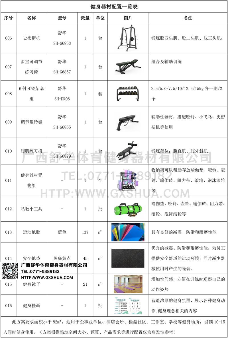 此方案要求面积小于82m²,适用于企事业单位、酒店会所、楼盘社区、工作室、学校等健身场所,能满10-15人同时健身使用。(方案根据场地空间大小、预算、产品需求等进行配置仅为启发性参考)