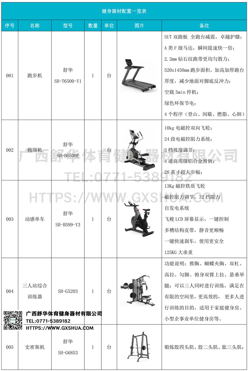 史密斯机(1台),多重可调节练习椅1台),腹肌训练器(1台),6付哑铃套组(1套),可调哑铃凳(1张),可以实现对不同肌肉群的针对性训练,满足肌肉训练需求,全方位激活身体机能。