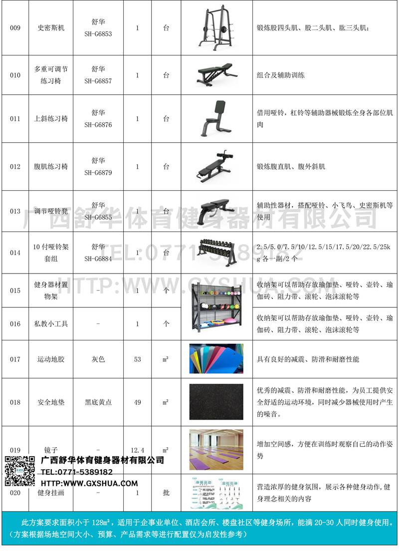 大飞鸟(1台)、史密斯机(1台)、多重可调节练习椅(1台)、腹肌训练器(1台)、罗马椅、上斜练习椅(1台)、10付哑铃套组(1套)、可调哑铃凳(1张)、私教小工具(一批)可以实现对不同肌肉群的针对性训练,满足肌肉训练需求,全方位激活身体机能。