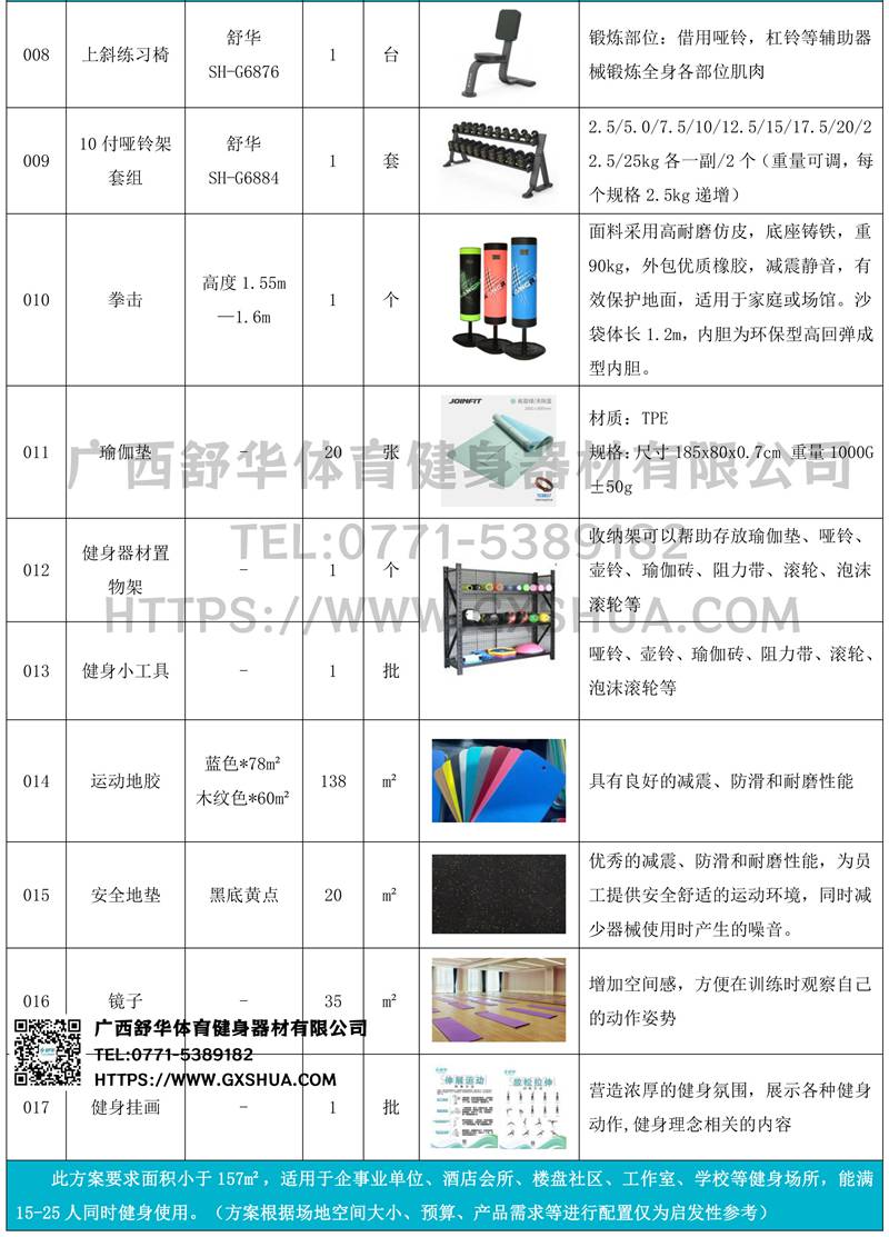 此方案要求面积小于157m²,适用于企事业单位、酒店会所、楼盘社区、工作室、学校等健身场所,能满15-25人同时健身使用。(方案根据场地空间大小、预算、产品需求等进行配置仅为启发性参考)