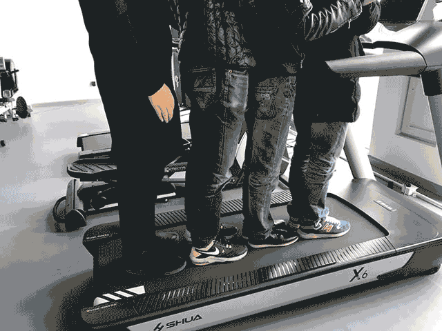 小编先和另外三个同事,一共四个人(约等于550斤)在上面站着,发现机器毫无压力继续正常运转。(看上图)小编不服, 为了检测这台机器究竟能承受多少重量,小编又加了一个人上去(总重量约等于700斤)。