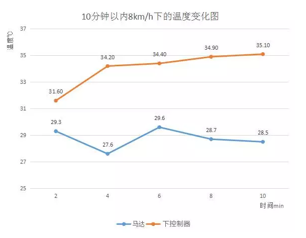 最后KS体育官方来看温度, 温度的变化可以直接看出马达质量的好坏,马达和下控制器的温度变化会影响马达的工作寿命。于是,小编就让同事(60kg)以8km/h的速度,持续跑了10分钟,测试马达和下控制器的温度变化,具体情况请看下图: